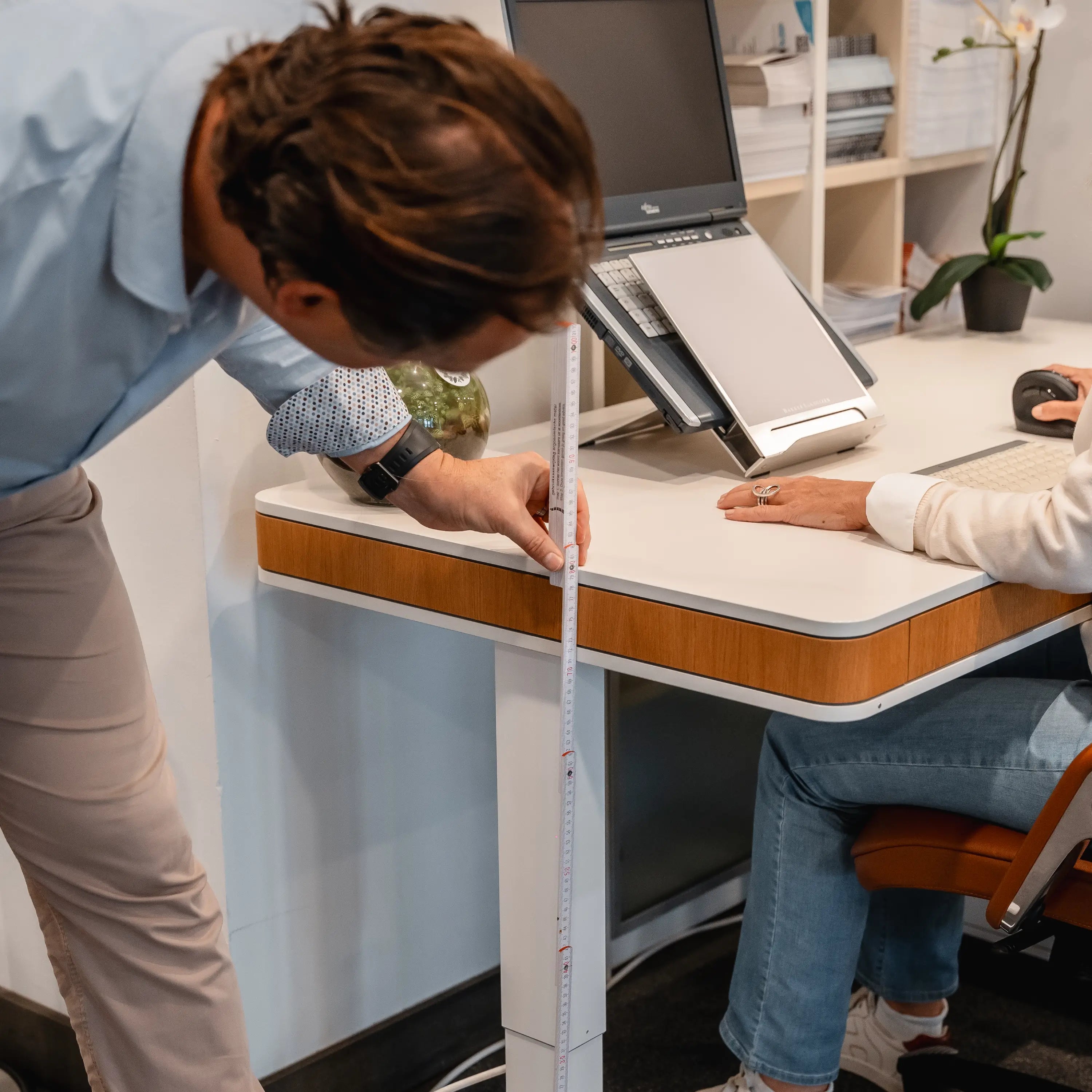 Een goed ingestelde bureaustoel is al het halve werk. Maar als je écht ergonomisch wil werken moet ook de werkplek onder handen genomen worden. Een scherm dat te laag staat, de bureauhoogte die niet correct is, een fout gebruik van computermuis,... Er zijn veel zaken buiten de stoel die toch nog voor klachten kunnen zorgen. Laat daarom onze adviseurs niet enkel de stoel, maar ook de werkplek instellen.