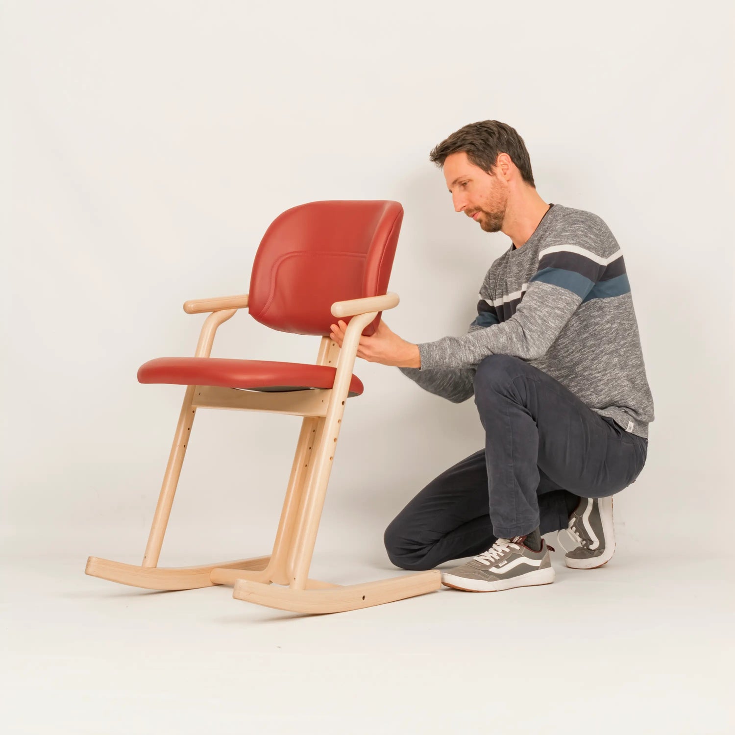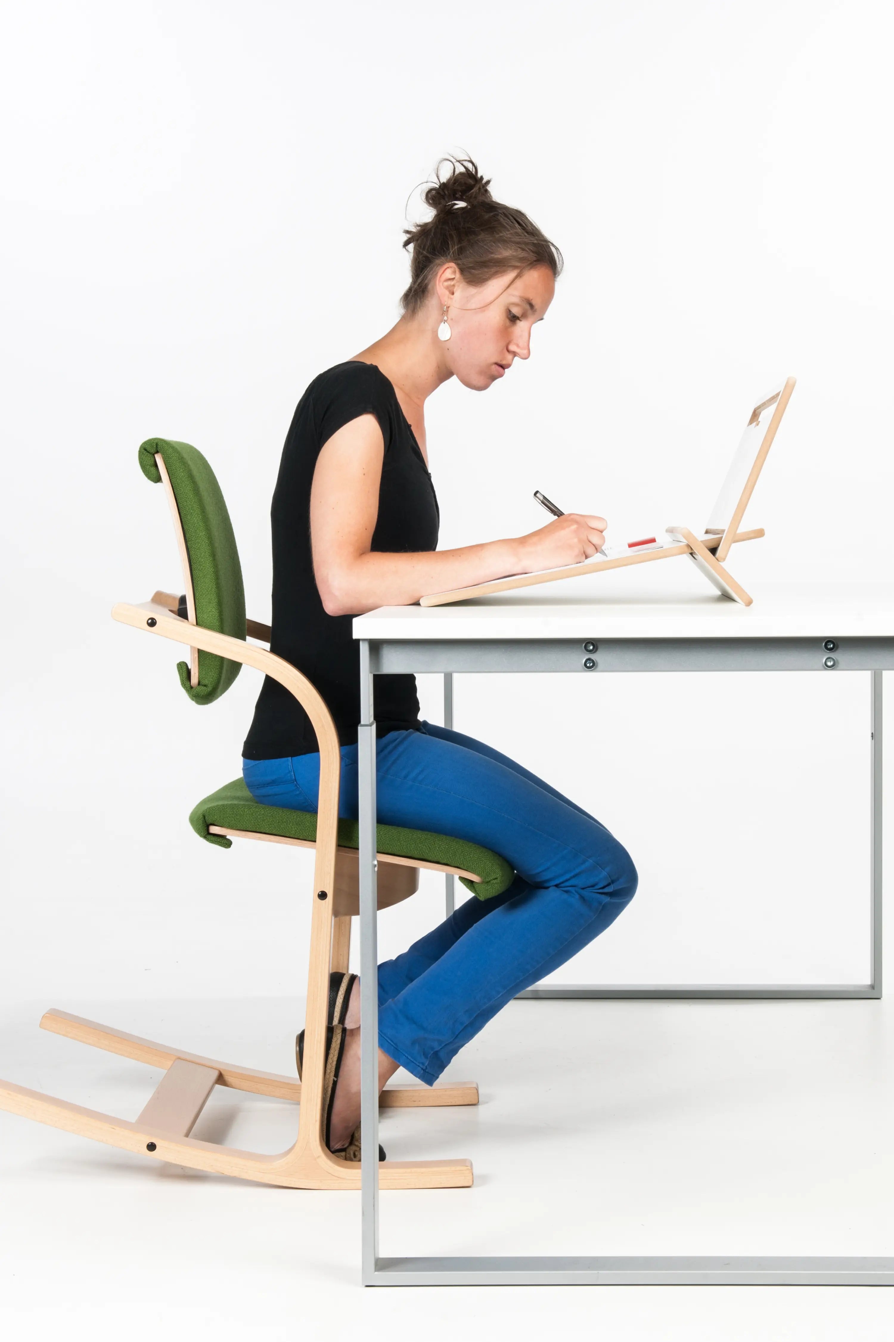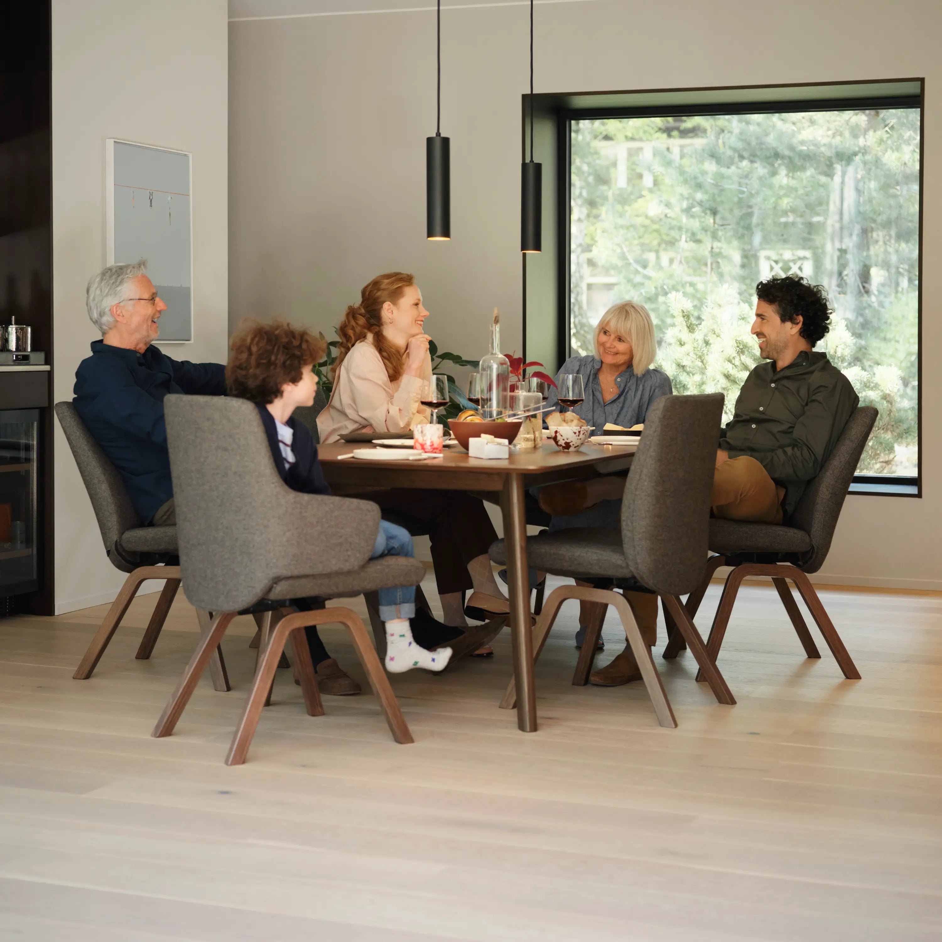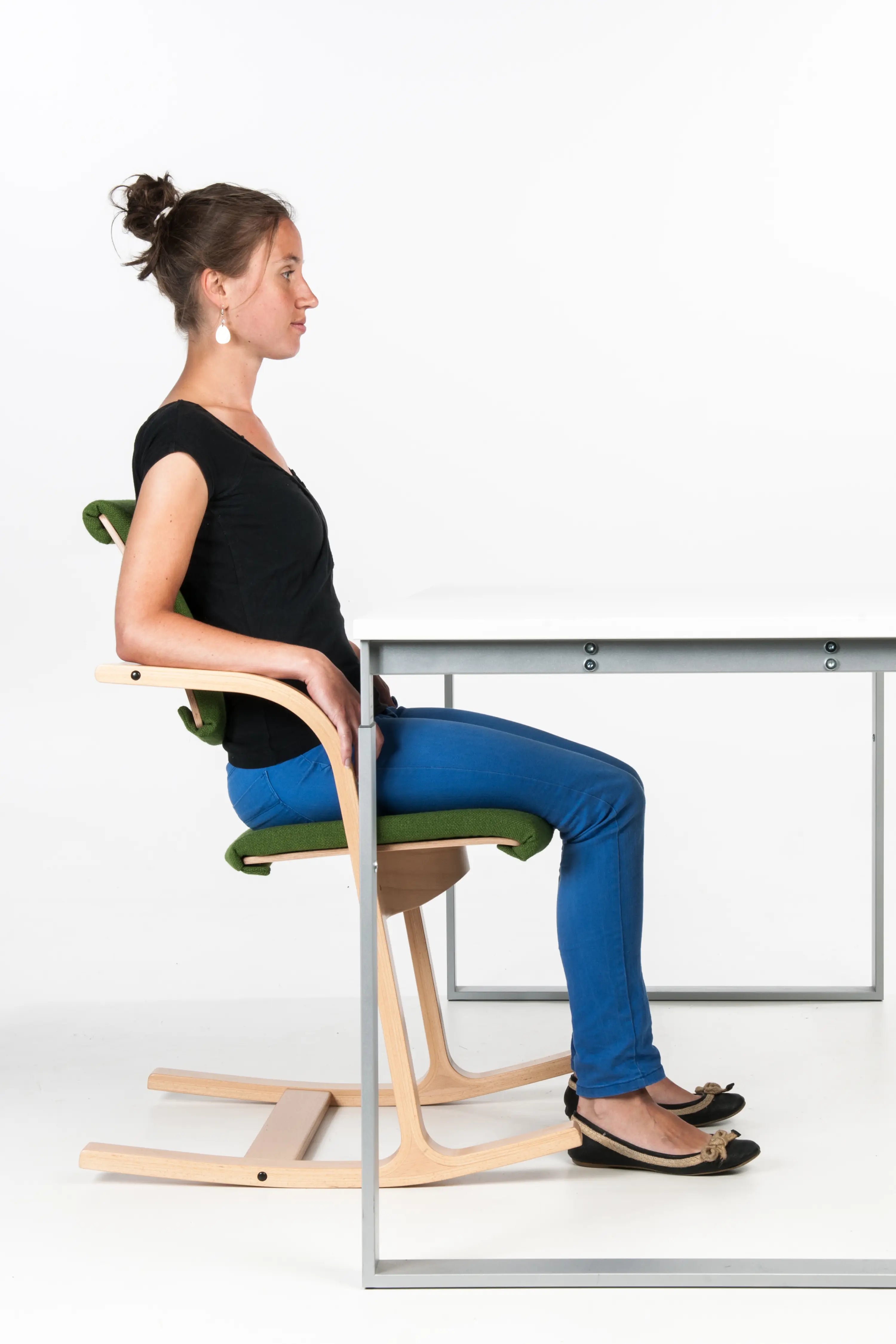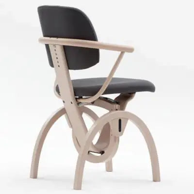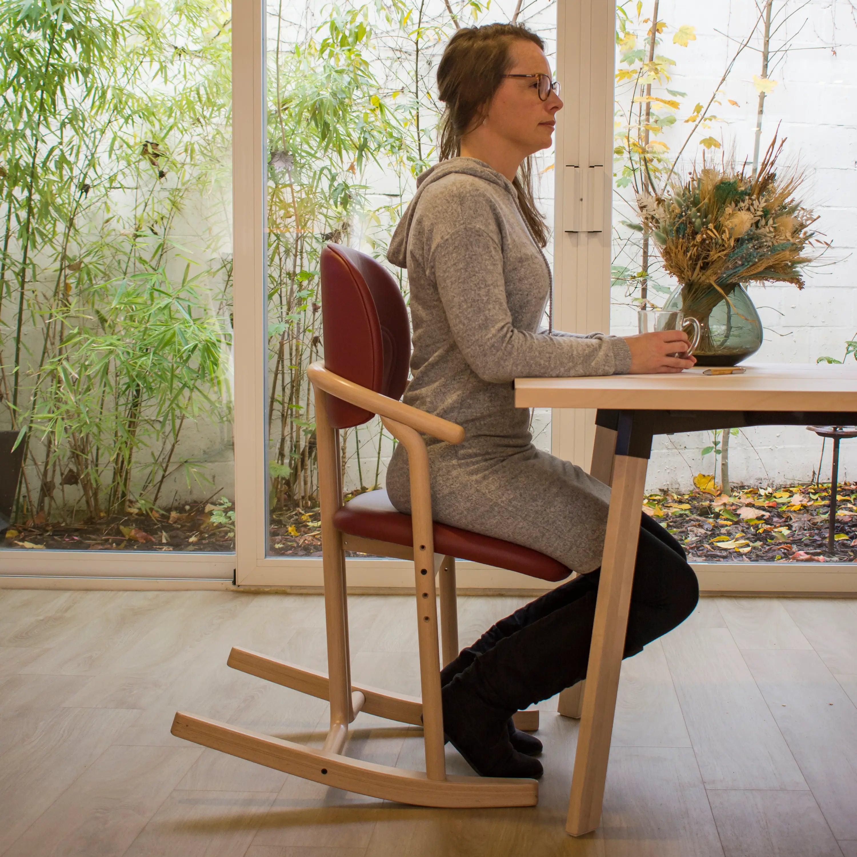 Een goede eetkamerstoel nodigt uit tot beweging. Het liefst zowel naar achter als naar voor mét open heup hoek. De hoek tussen benen en romp moet groter worden dan 90° zodat het bekken neutraal naar voor kan kantelen. Zo krijg je de meest neutrale positie van je wervelkolom en vermijd je rugklachten tijdens het tafelen.