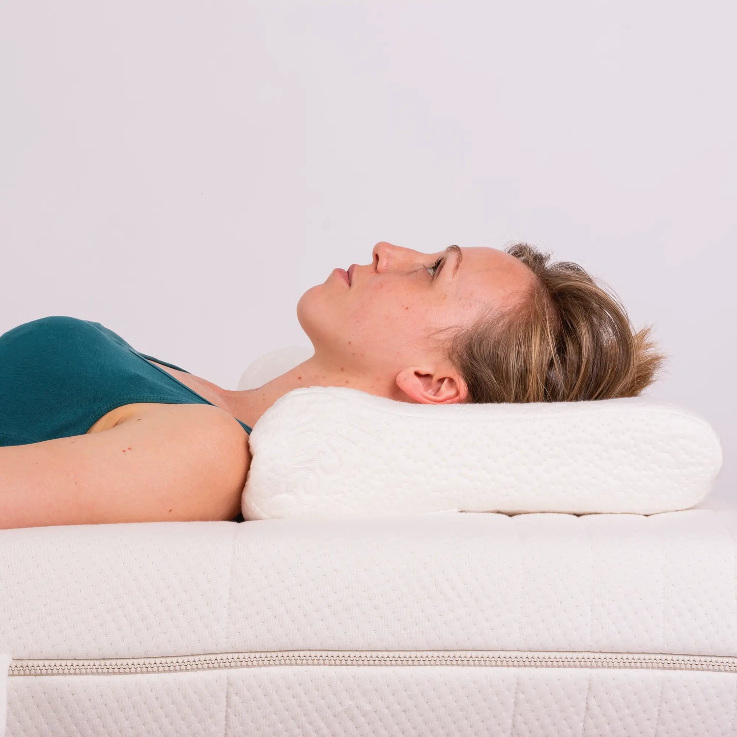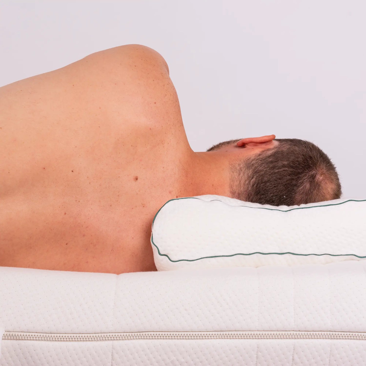 Een goed hoofdkussen geeft voldoende steun aan de nekholte en laat ruimte voor het hoofd.