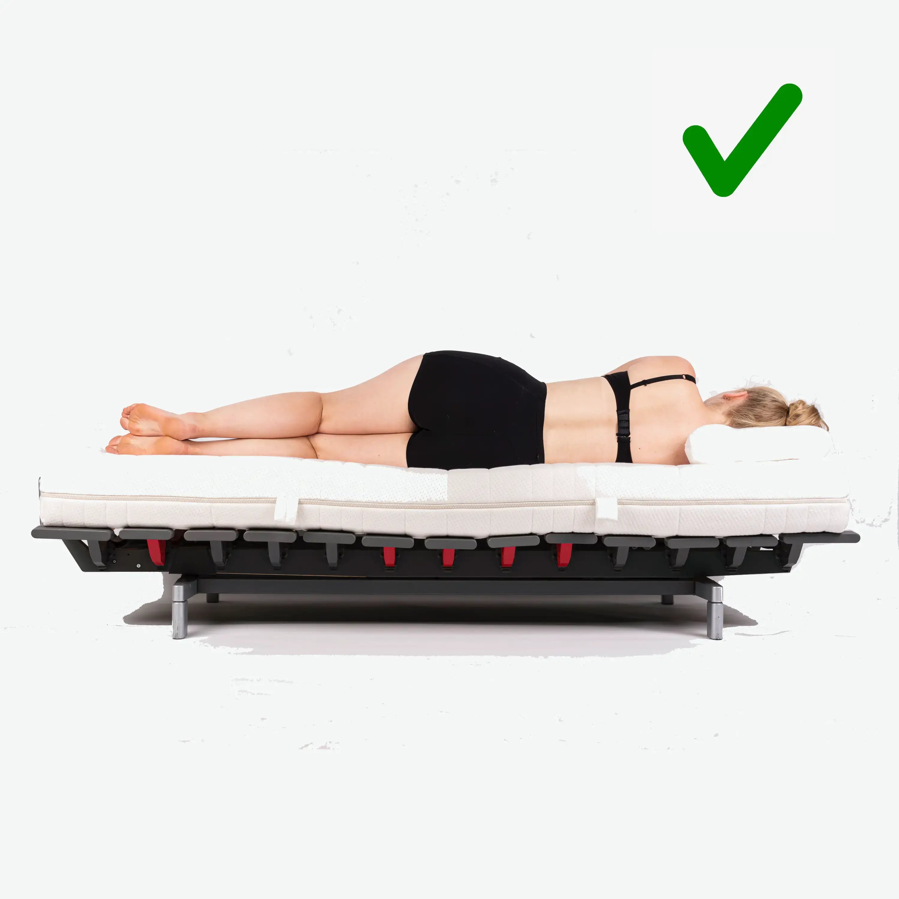 Als de latten van de bodem instelbaar zijn in hardheid en voldoende beweeglijk zijn, halen we de ondersteuning uit de lattenbodem. De ideale matras is dan een elastische natuurlatexmatras die de ondersteuning goed doorgeeft. Als de bodem niet instelbaar is moet de ondersteuning komen uit een (instelbare) pocketverenmatras.