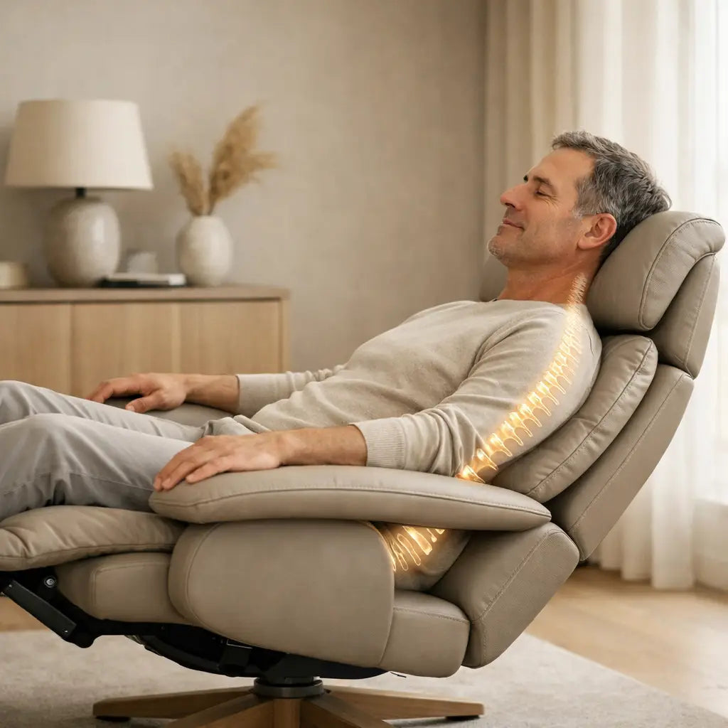 Een ergonomische relaxzetel ondersteunt de natuurlijke kromming van de wervelkolom en laat toe om zithouding en ontspanning af te wisselen. Dit vermindert spierspanning en verhoogt het comfort, ook bij langdurig zitten.