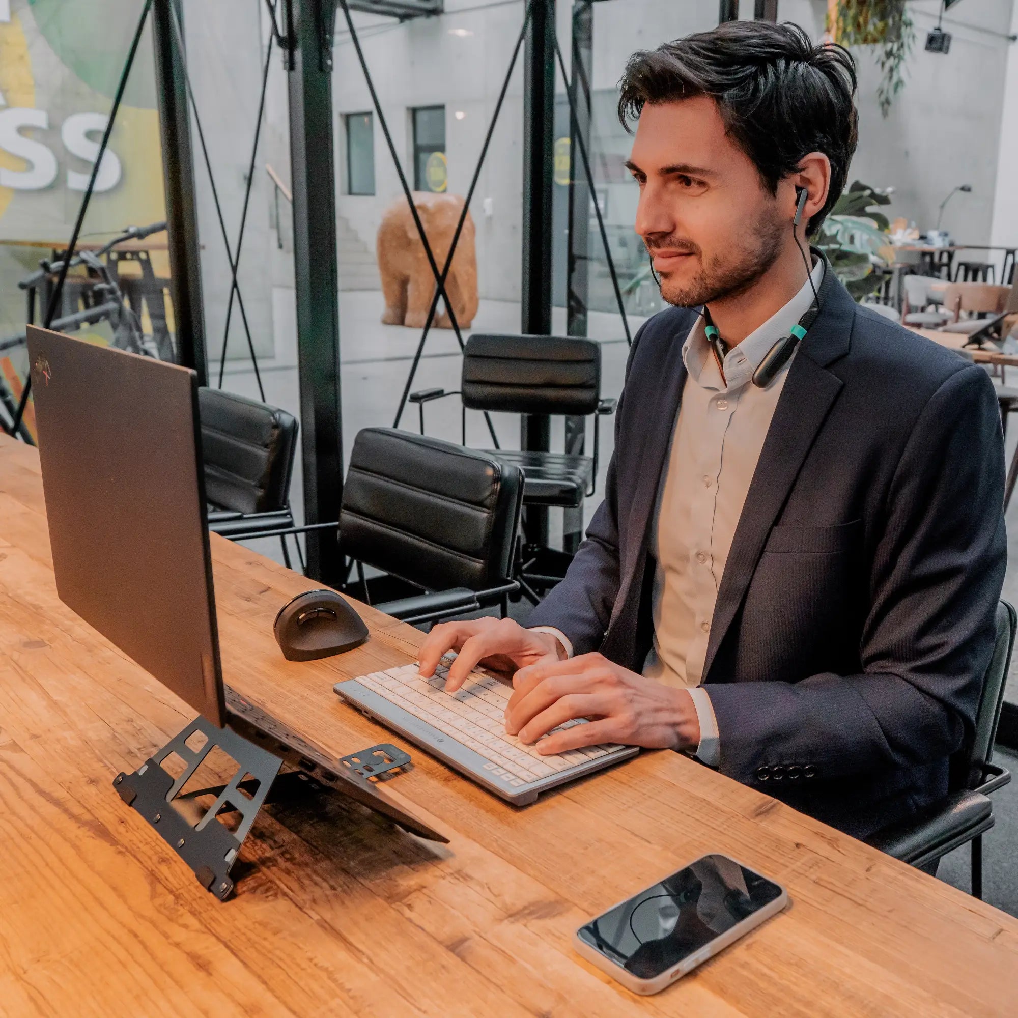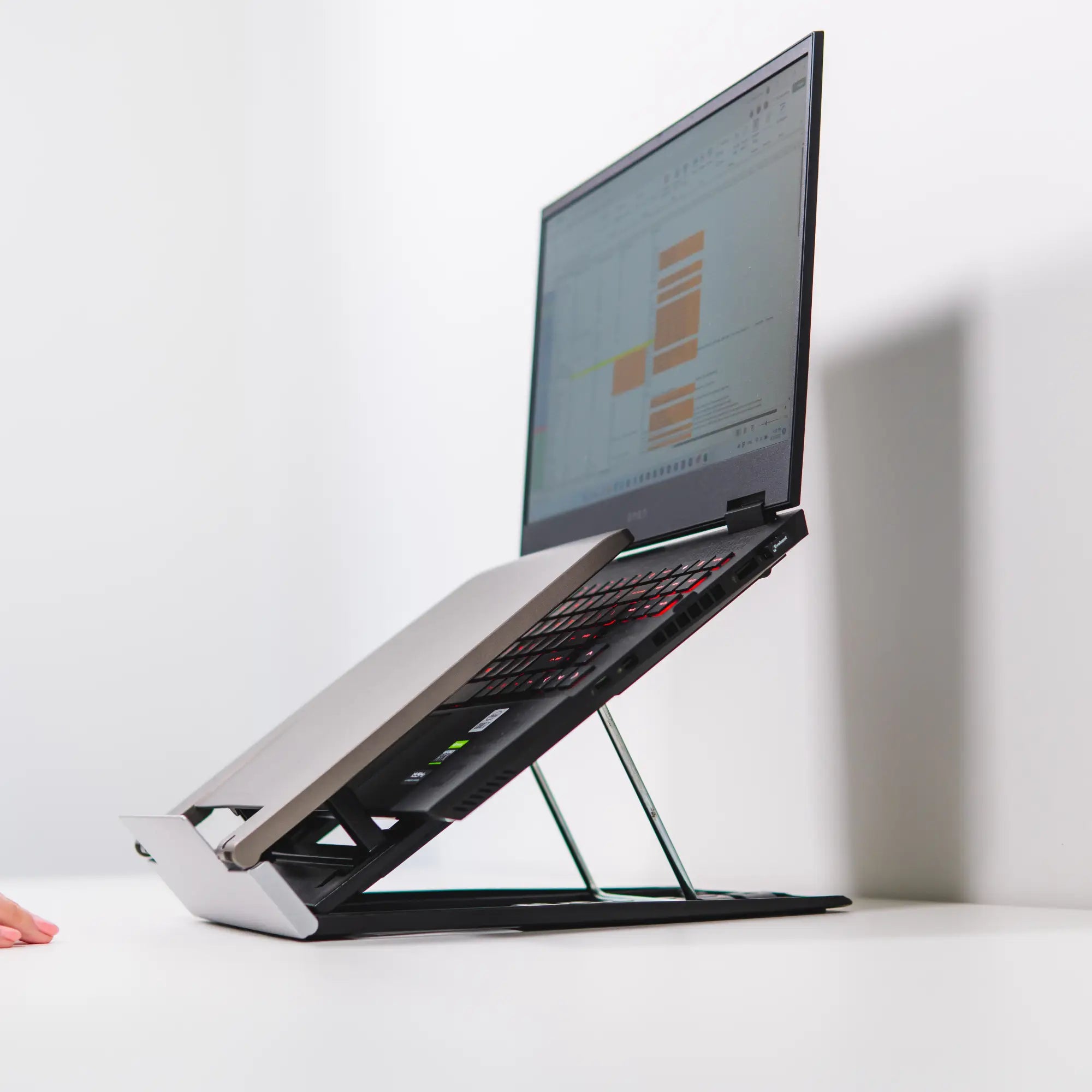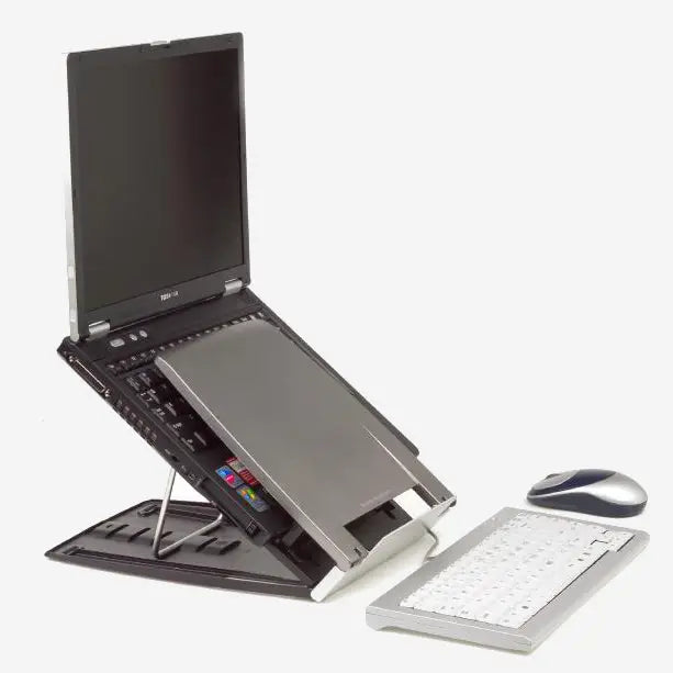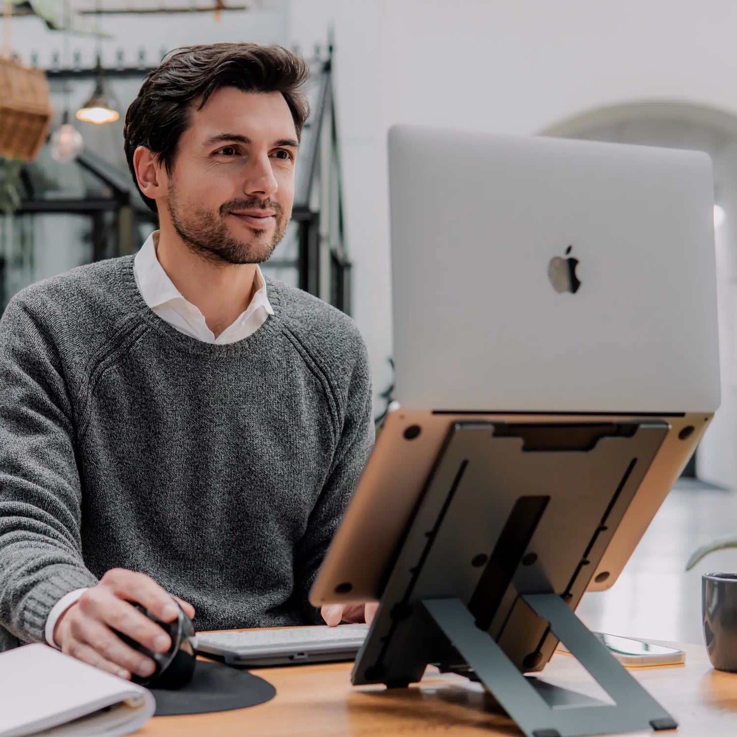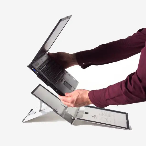Waarom kiezen voor een laptophouder? Dit is een zeer gemakkelijk en zinvol hulpmiddel. Op een eenvoudige manier kan je je laptop verhogen in verschillende posities. Sluit een externe ergonomische muis aan en een toetsenbord en je bent vertrokken. Je kan hem volledig dichtplooien, wat maakt dat je hem gemakkelijk meeneemt in je laptoptas. Gebruik het overal: bij je thuis, op kantoor, tijdens de vergadering,… Zorg ervoor dat je laptopscherm voortaan altijd op ooghoogte staat! Zo werk je comfortabeler en vermijd je nek- en rugklachten.