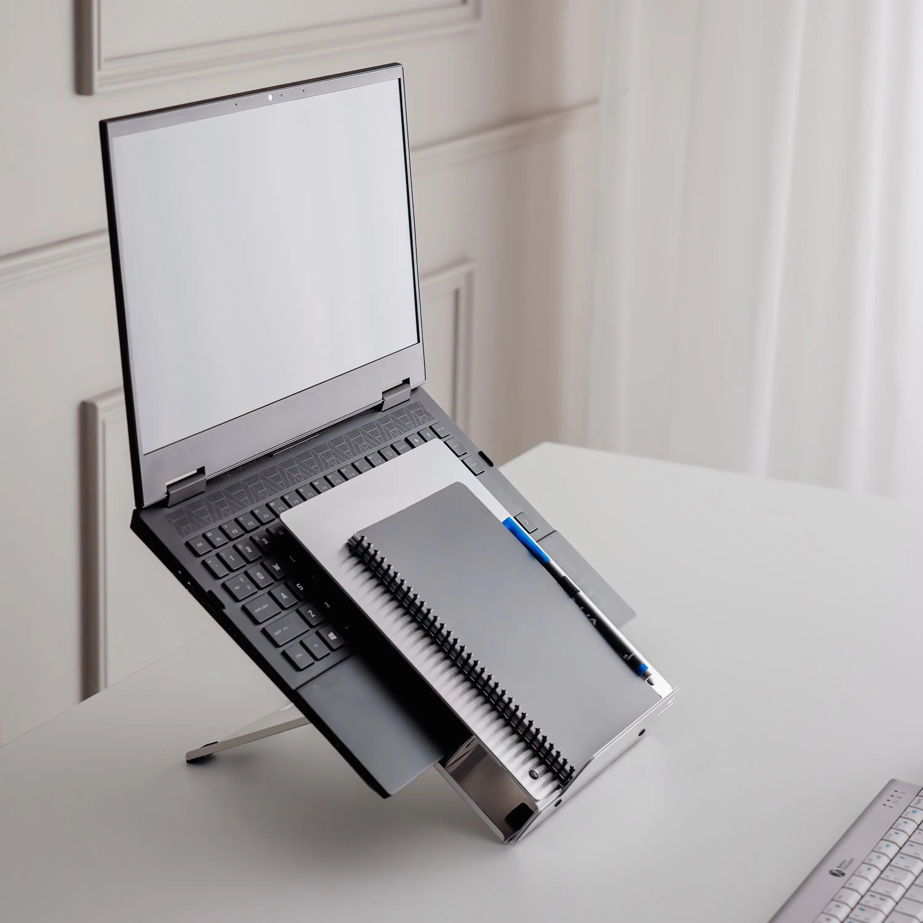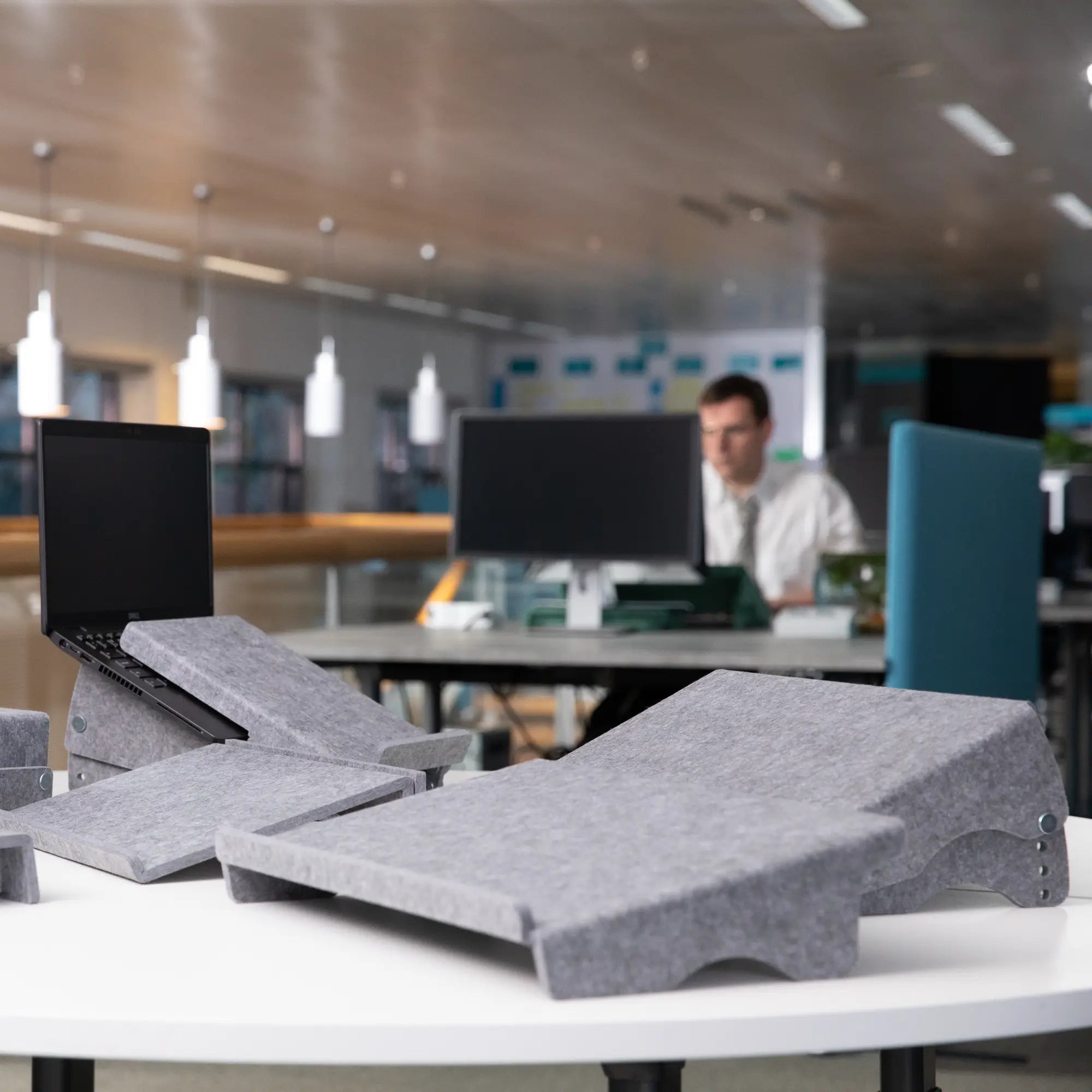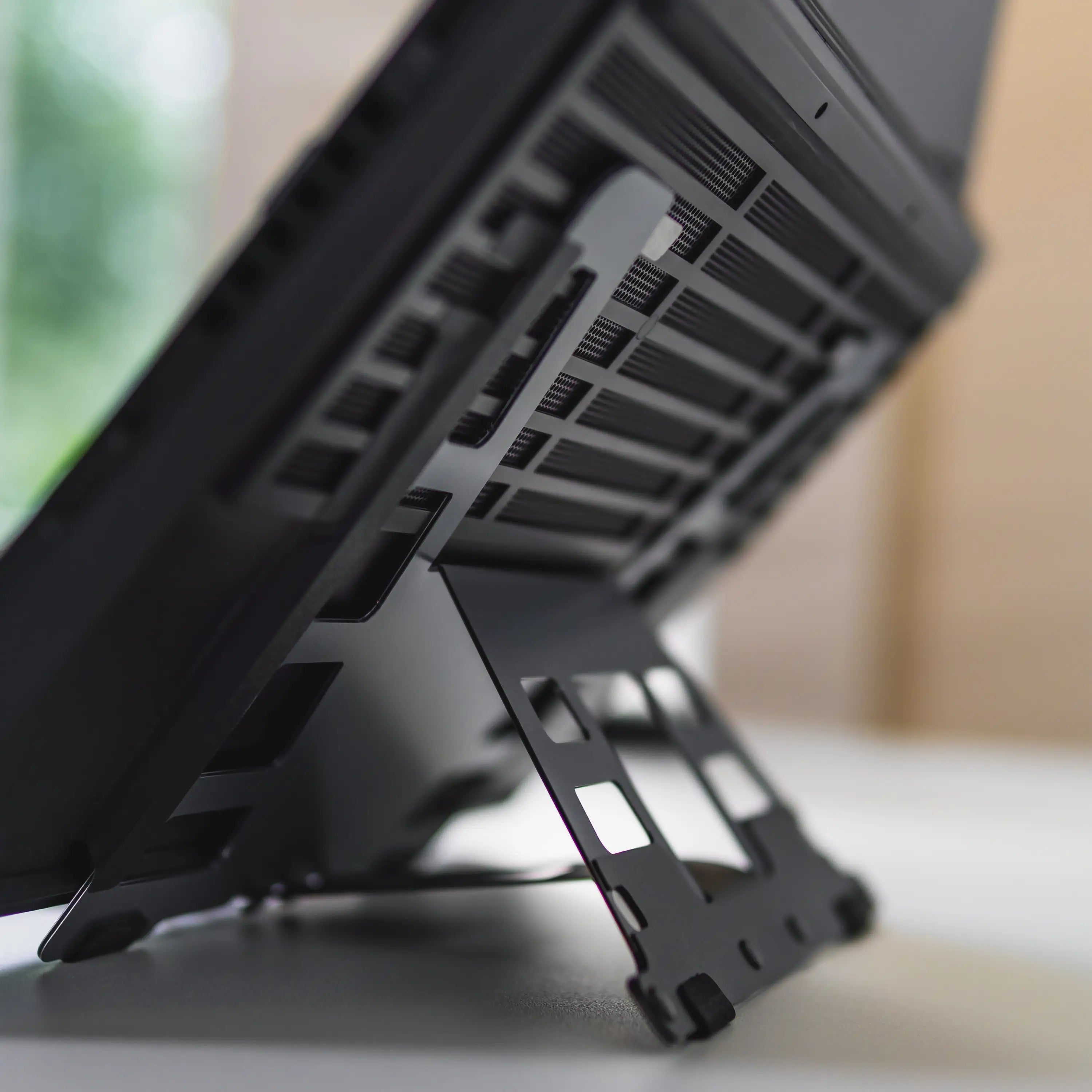 Waarom kiezen voor een laptophouder? Dit is een zeer gemakkelijk en zinvol hulpmiddel. Op een eenvoudige manier kan je je laptop verhogen in verschillende posities. Sluit een externe ergonomische muis aan en een toetsenbord en je bent vertrokken. Je kan hem volledig dichtplooien, wat maakt dat je hem gemakkelijk meeneemt in je laptoptas. Gebruik het overal: bij je thuis, op kantoor, tijdens de vergadering,… Zorg ervoor dat je laptopscherm voortaan altijd op ooghoogte staat! Zo werk je comfortabeler en vermijd je nek- en rugklachten.