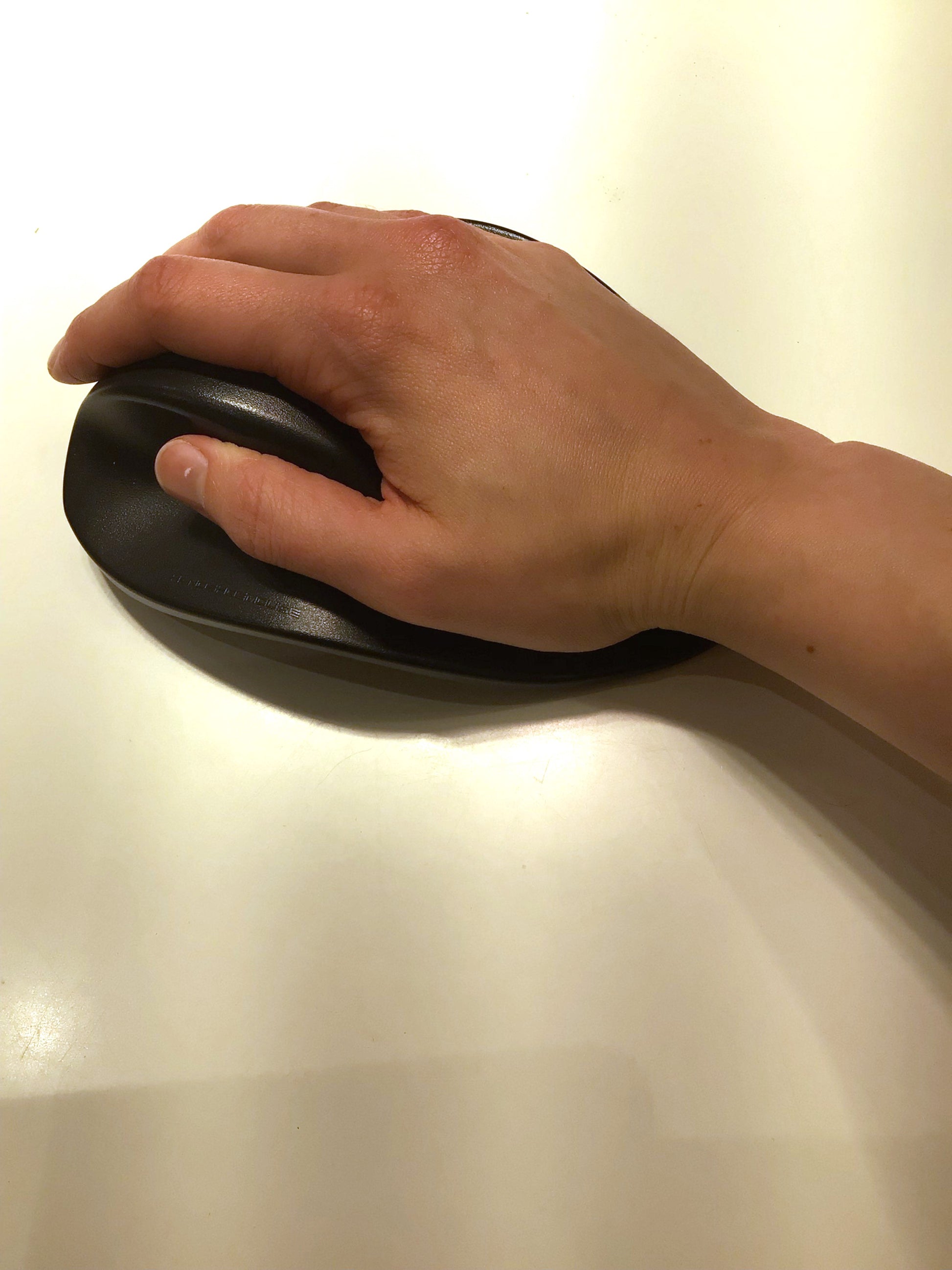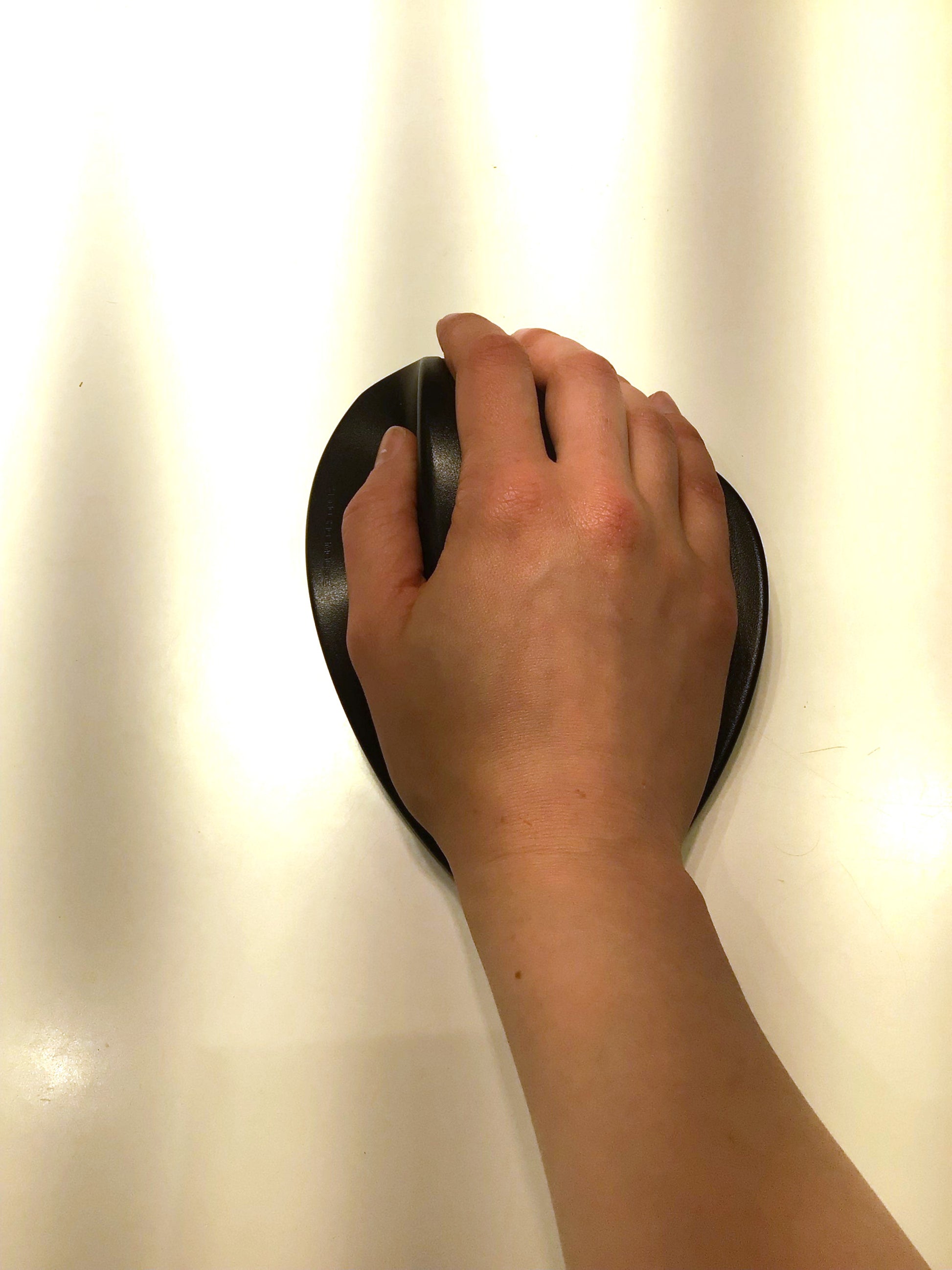 La souris est conçue pour éviter toute tension musculaire excessive au niveau de la main, des doigts et du pouce. Grâce à sa forme, vous n'avez pas besoin de la saisir fermement ni de lever le doigt pour l'utiliser. Il vous suffit de la faire glisser sur la surface du bureau.
