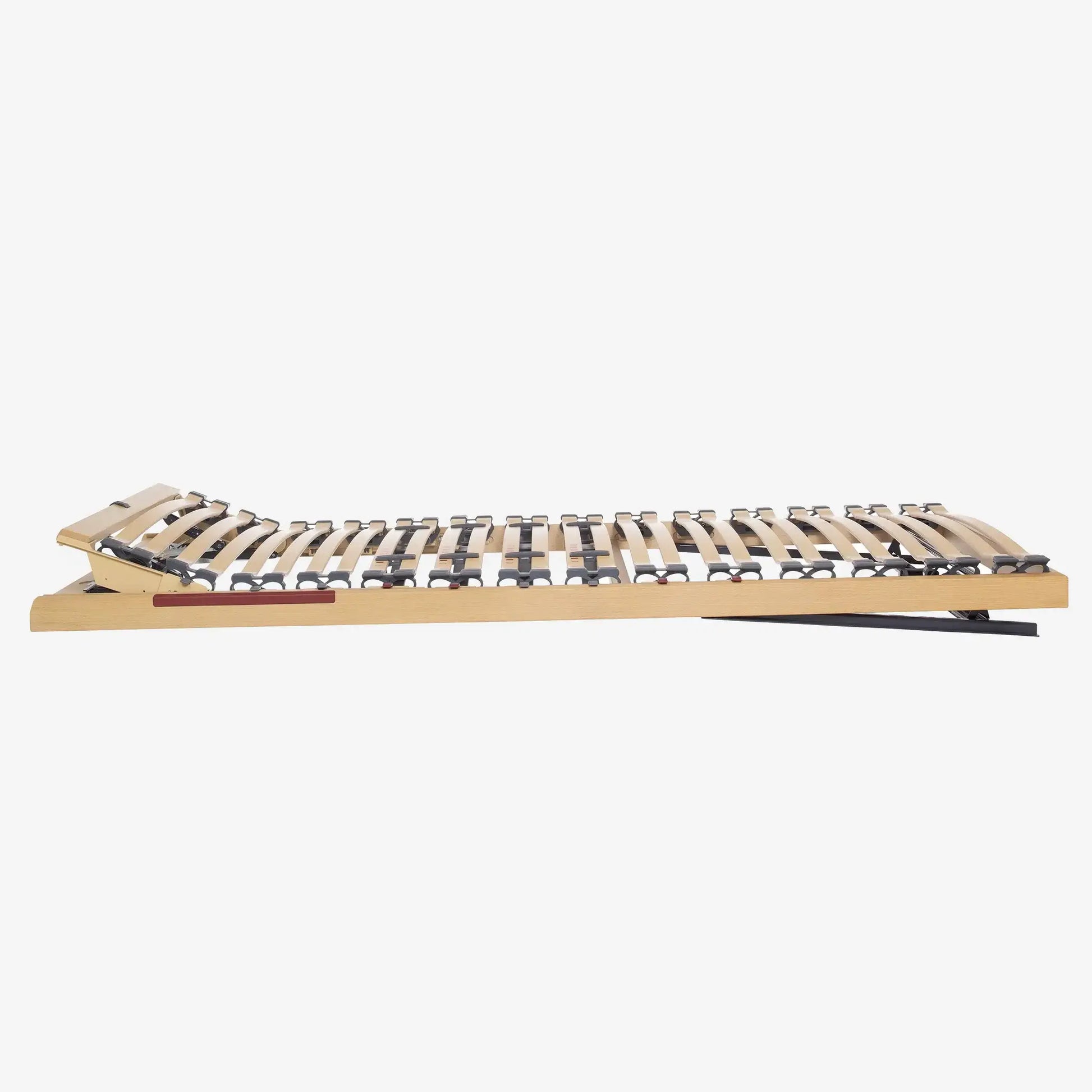 Lattenbodem met handverstelbaar hoofdeinde en verhoogbaar voeteinde voor comfort, ergonomie en circulatie, duurzaam geproduceerd in Duitsland.