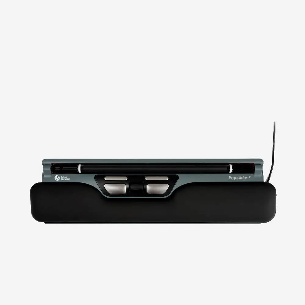 De ErgoSlider Plus is een centrale ergonomische muis die recht vóór het toetsenbord ligt, zodat je in een natuurlijke, rechte houding werkt zonder onnodige armbewegingen. De bediening verloopt via een 24 cm brede, aanklikbare rollerbar, bruikbaar met beide handen – wat spanning op schouders en armen aanzienlijk vermindert. De muis beschikt over vier functietoetsen (klik, dubbelklik, kopiëren en plakken), een soepel scrollwiel en een verwisselbare polssteun voor extra comfort.