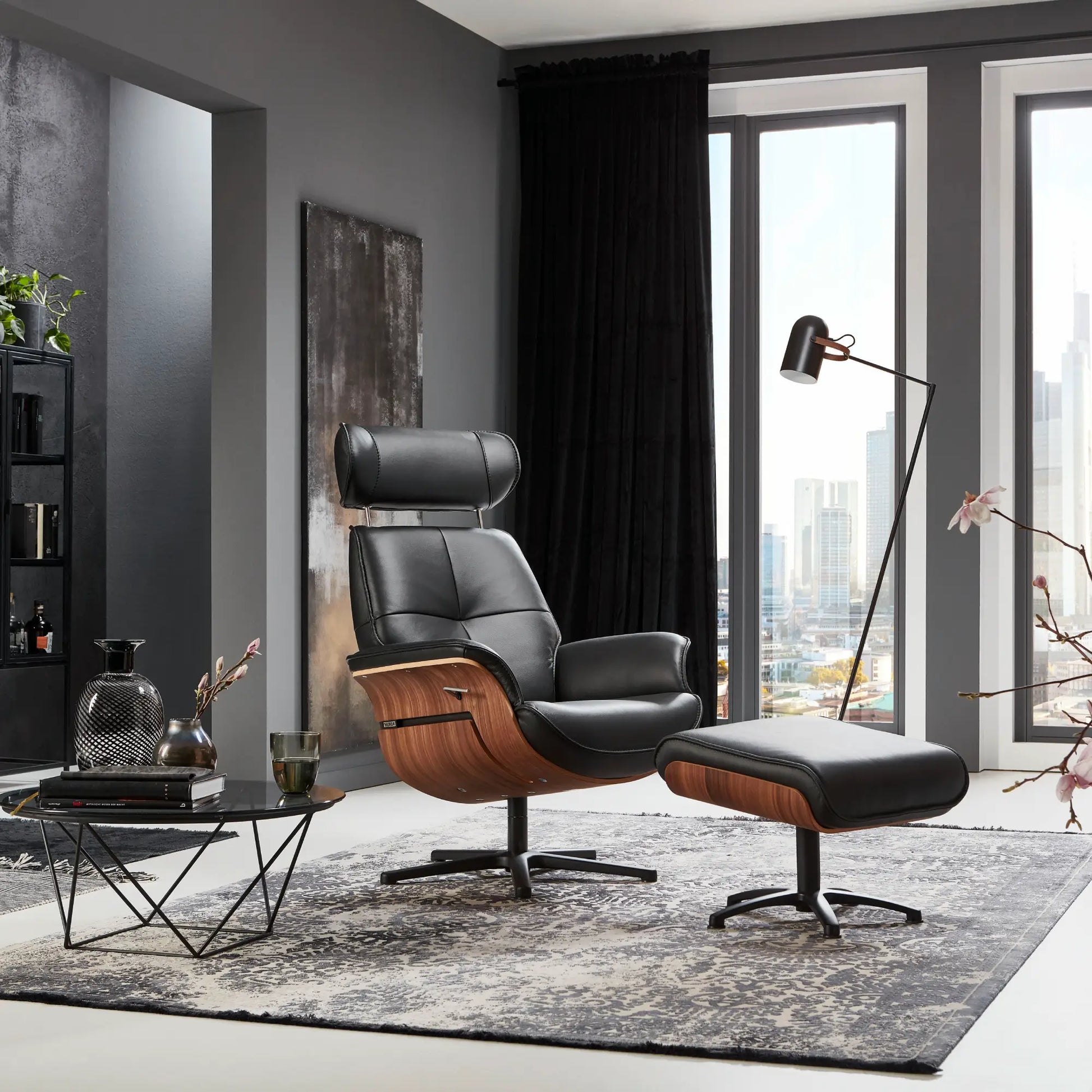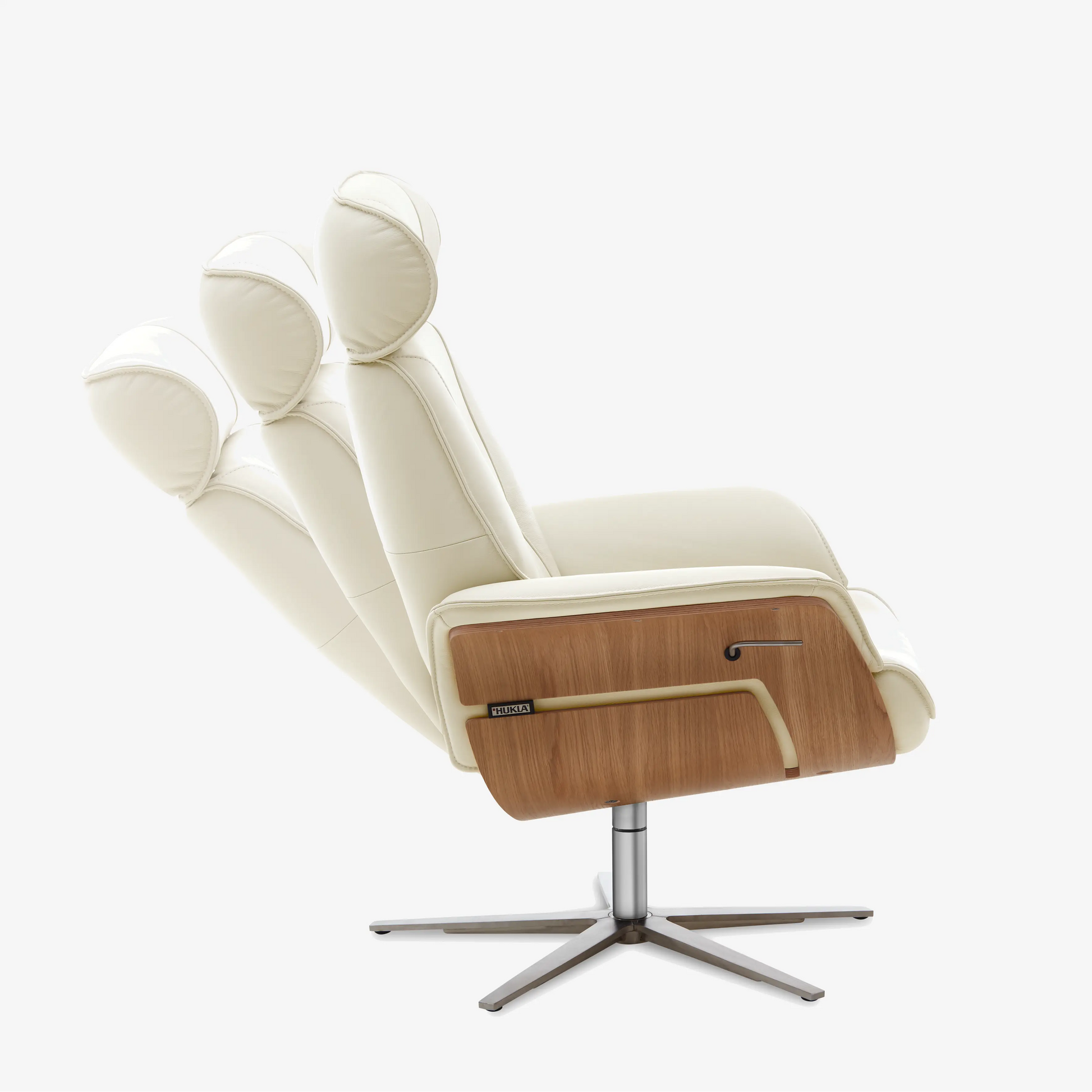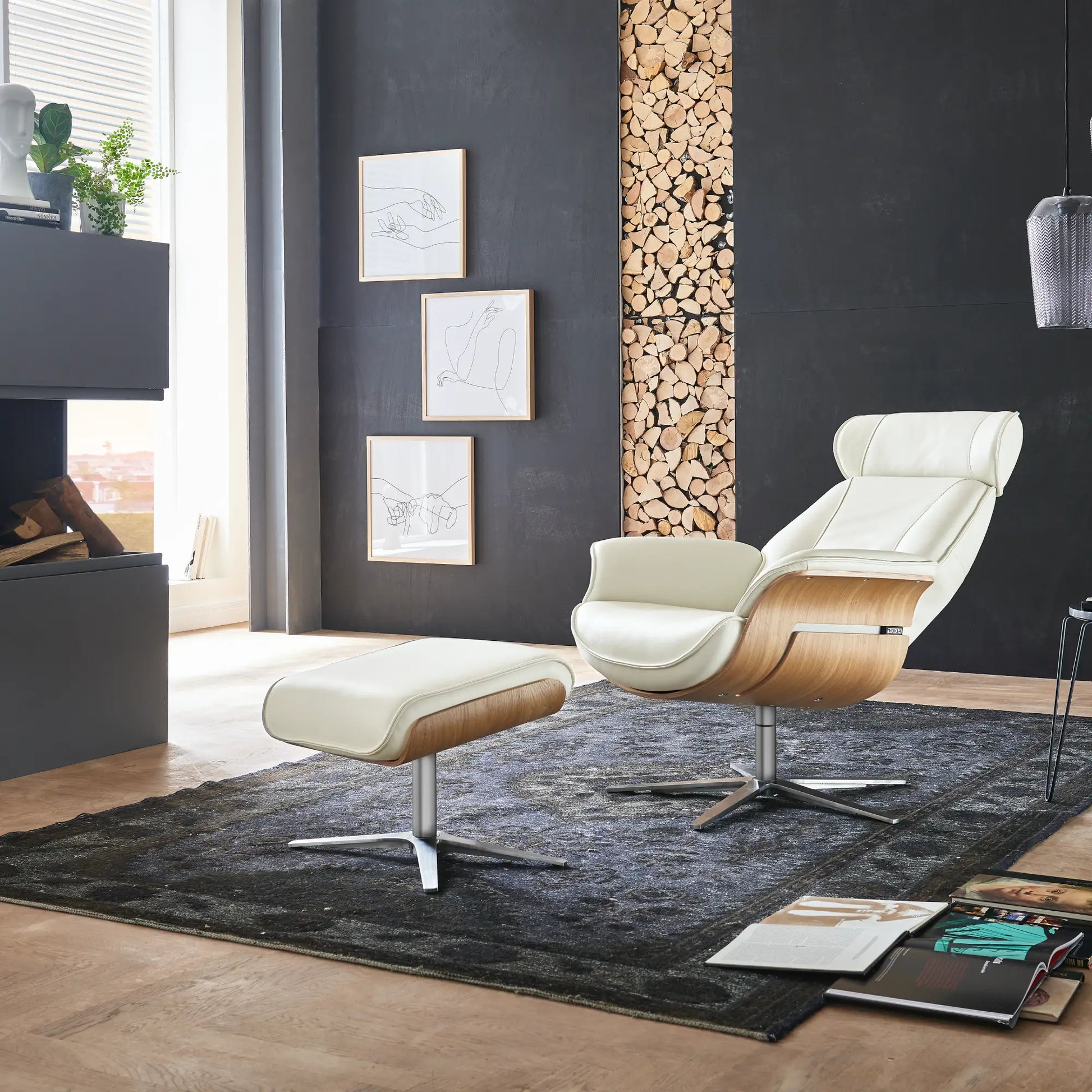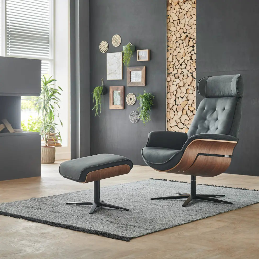 James Relaxfauteuil – Design en Comfort in Harmonie De James is een stijlvolle, 360° draaibare relaxzetel met een elegante houten kuip en hoogwaardige afwerking. Dankzij de verstelbare rugleuning, aanpasbare hoofdsteun en keuze uit verschillende onderstellen, houtkleuren en bekledingen past hij zich perfect aan jouw wensen én interieur aan. Een moderne eyecatcher die comfort en klasse moeiteloos combineert.
