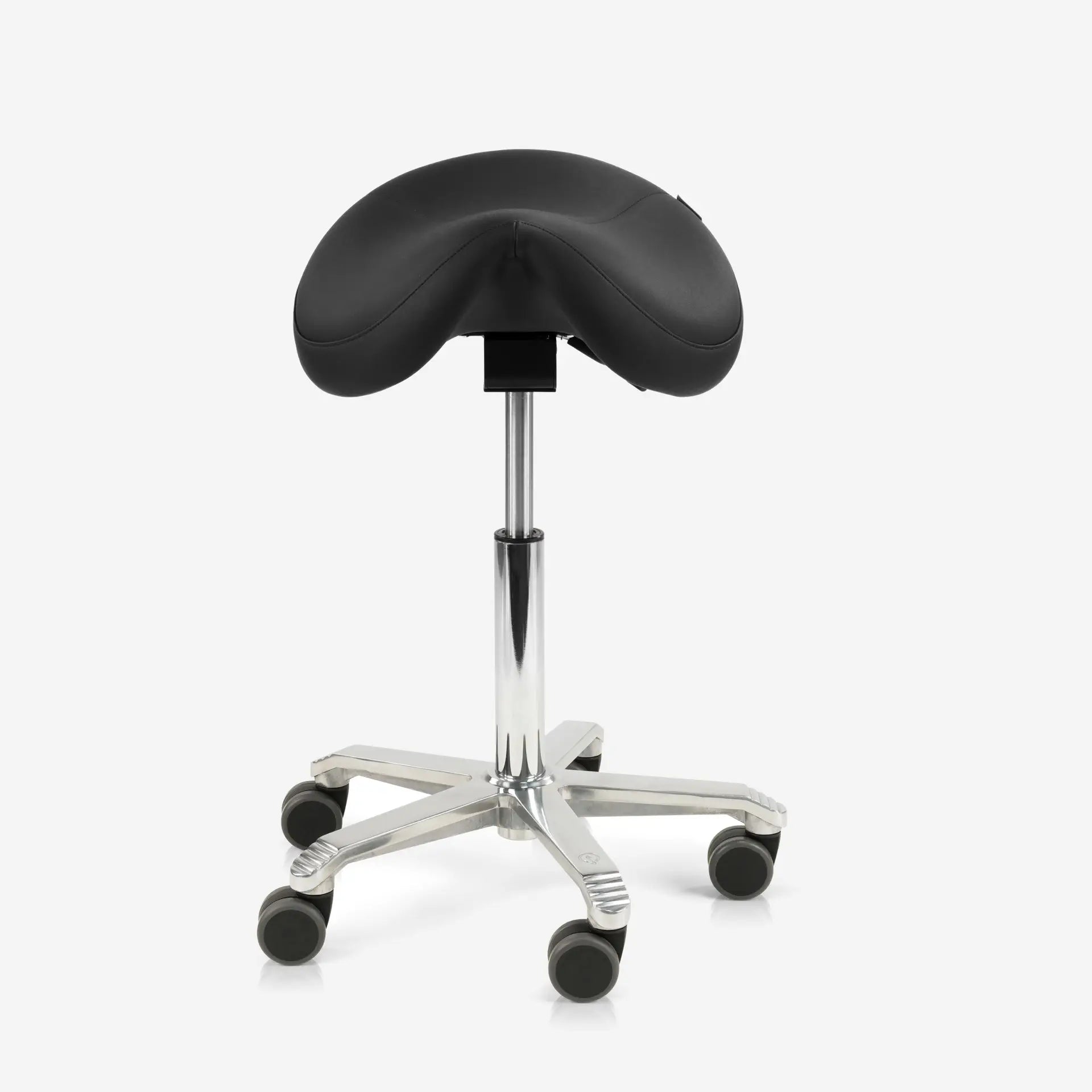 De Jumper zadelkruk is een ergonomische kruk met een brede zadelzitting van ca. 44 × 30 cm. Deze vorm kantelt het bekken subtiel, waardoor de wervelkolom in een natuurlijke houding komt. Dat ontlast de rug, bevordert een goede ademhaling en stimuleert de doorbloeding. Dankzij de bredere zitting staan benen en voeten wat verder uit elkaar, wat zorgt voor een stabiele en actieve zit.