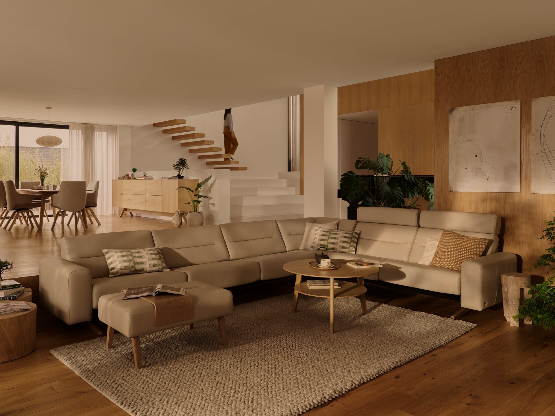 Stressless® Stella is een zachte en eigentijdse modulaire bank die reageert op uw bewegingen. Met het Stressless® BalanceAdapt™-systeem kan de bank reageren op uw natuurlijke bewegingen, waarbij de zitting wordt aangepast terwijl u beweegt. Leun achterover of voorover, ga liggen, leg uw voeten omhoog en voel hoe de zachte en genereuze zitting zich aanpast aan uw positie. Als de omstandigheden vragen om een gewone bank kunt u de functie simpelweg vergrendelen zodat de zitting niet meer beweegt. Verkrijgbaar met verschillende armleuningen, zittingbreedtes, hoek- en aangepaste hoofdsteun en voetenbankje.