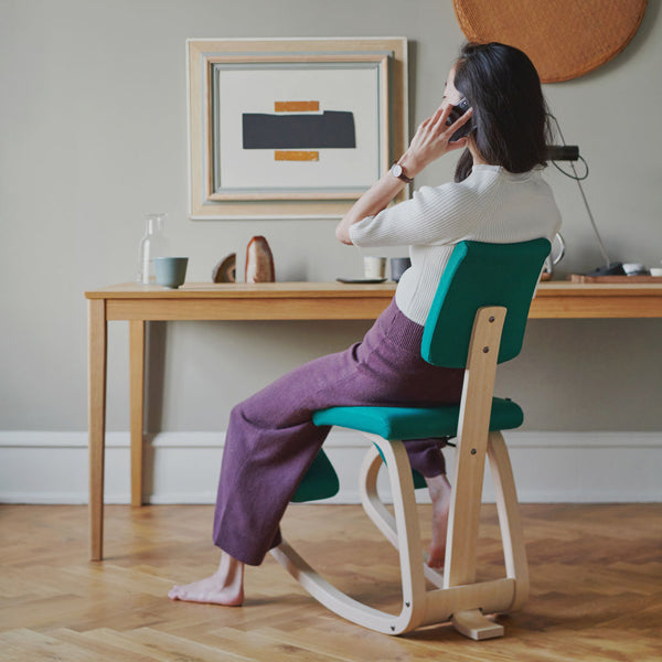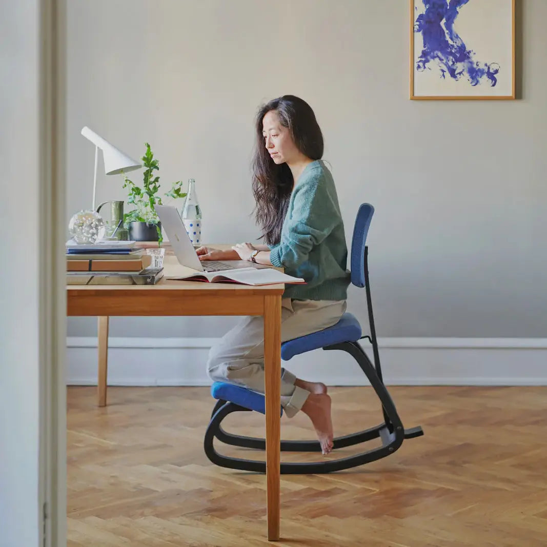 Dankzij de kenmerkende gebogen lopers beweegt de stoel mee met jouw lichaam. Zo blijft je bloedsomloop actief en je concentratie op peil – ideaal voor werk, studie, creatief werk of meditatieve momenten. Leun naar achteren tegen de rond gevormde rugleuning en wissel naadloos af tussen actief en rustgevend zitten.
