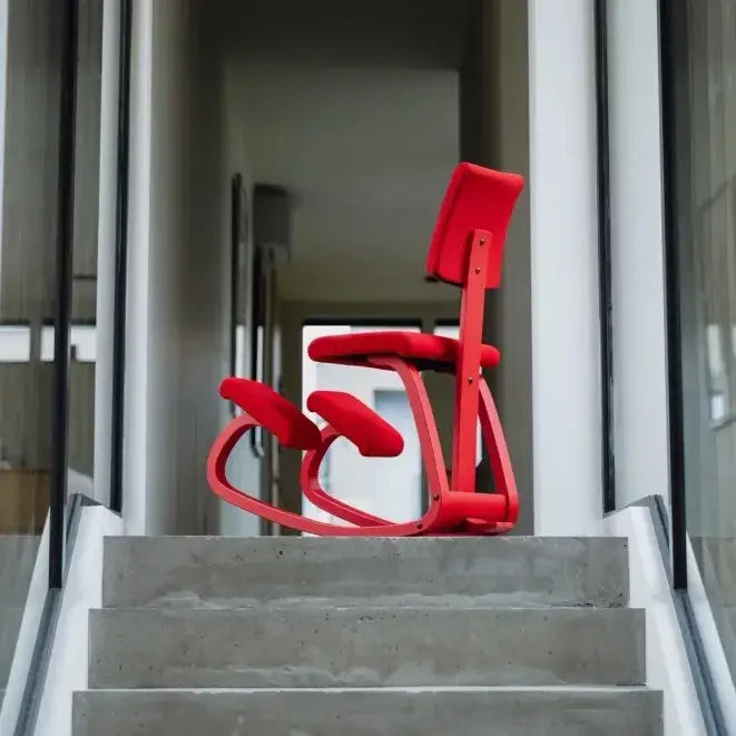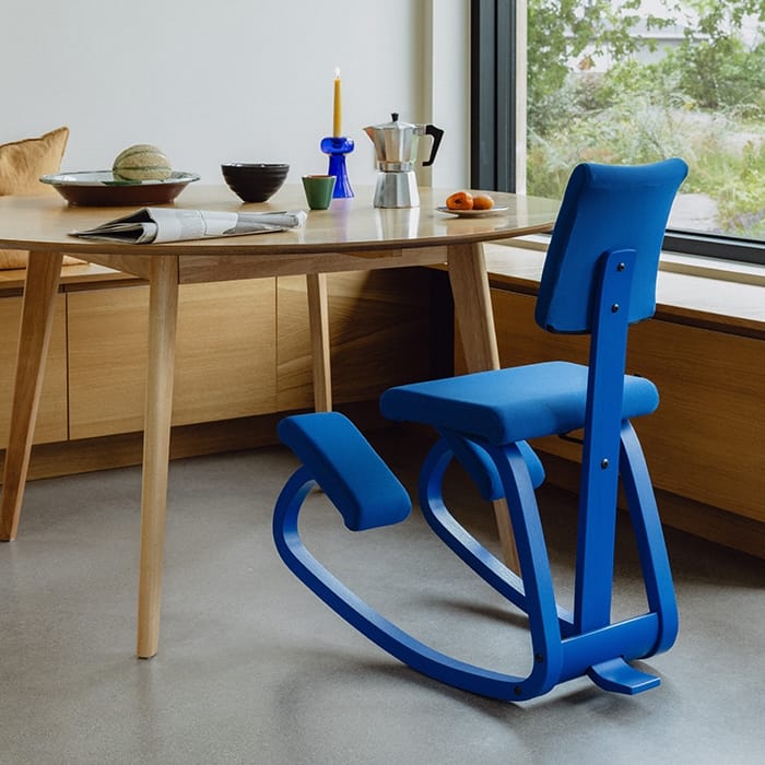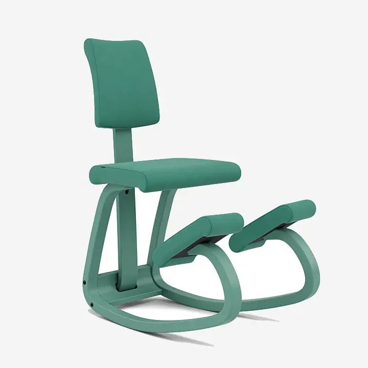 Deze uitvoering combineert het bekende actieve zitten van de Variable Plus met een (vast) gestoffeerde rugleuning. De kniesteun en het gebogen houten frame stimuleren een dynamische zithouding en bevorderen de natuurlijke lichaamshouding zonder mechanische verstelmogelijkheden.